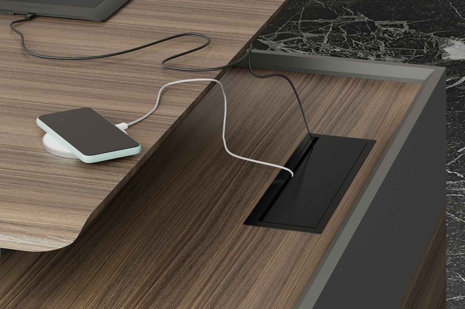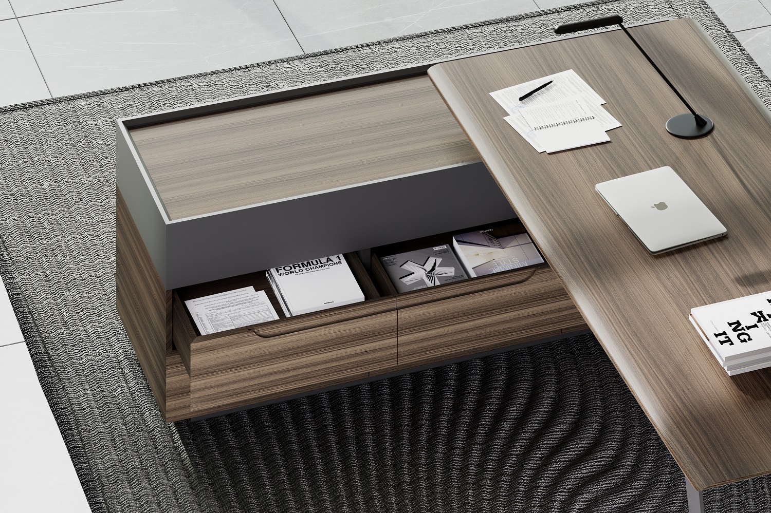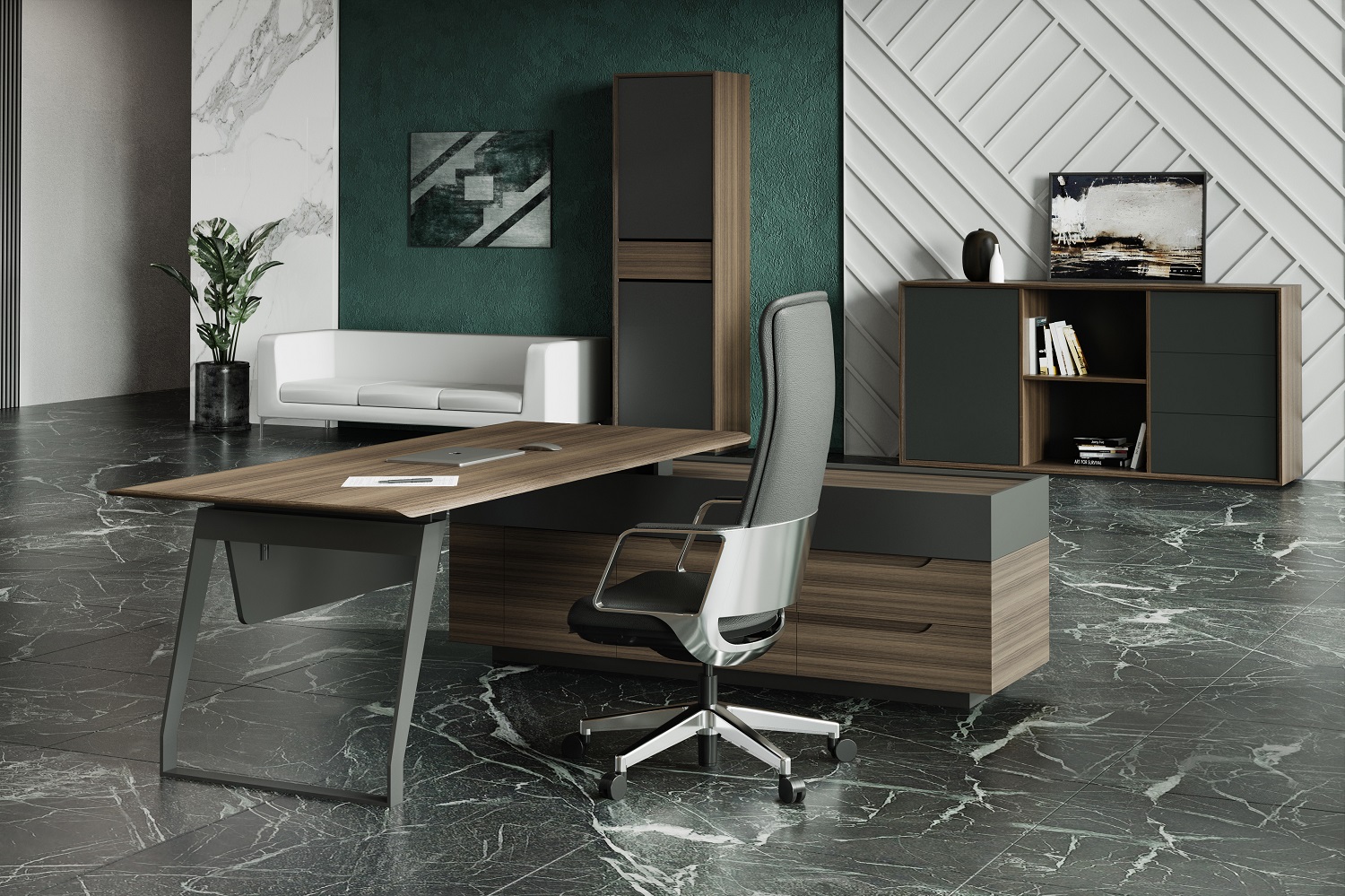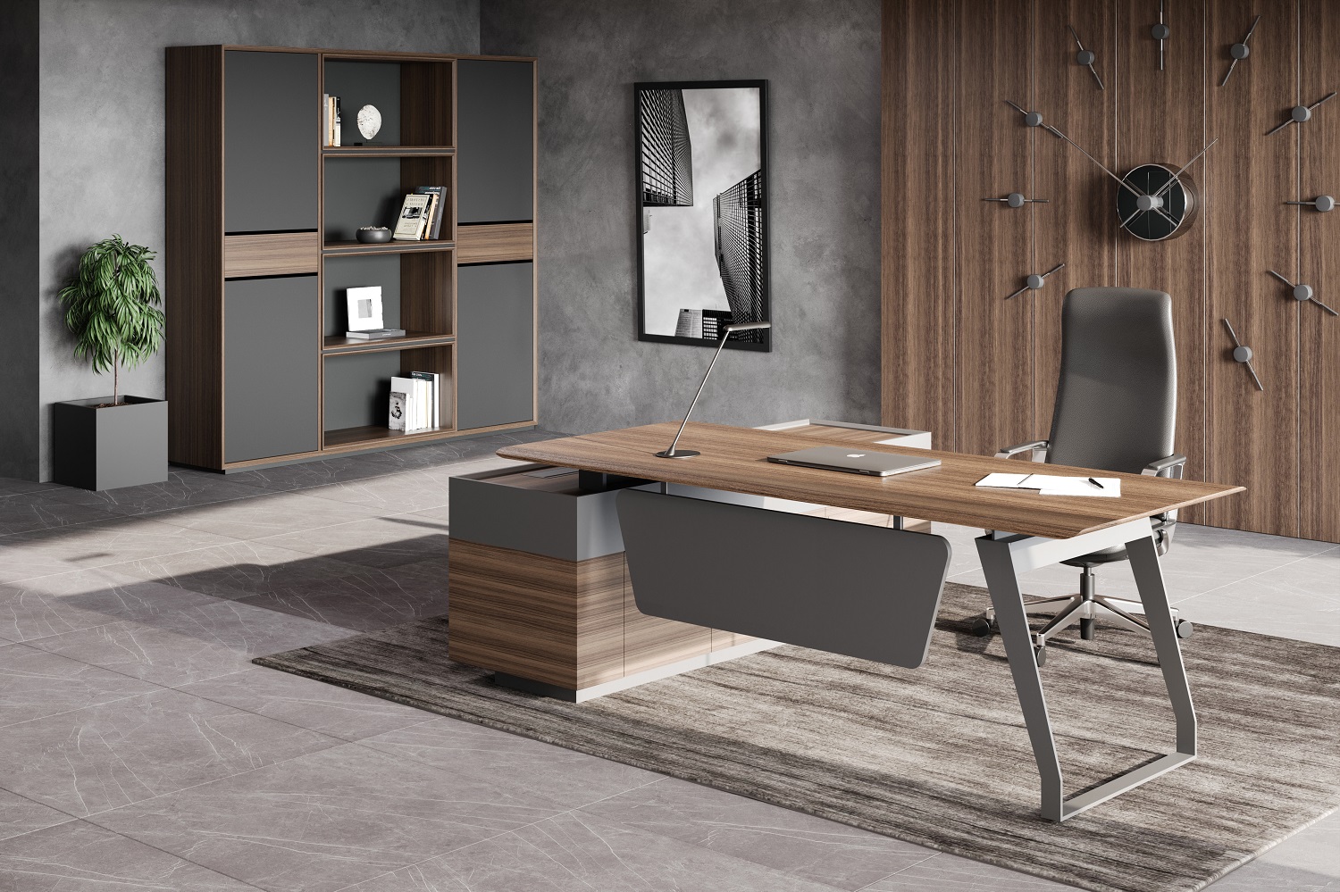 Кабинет QUARTZ - эпицентр всех ключевых событий и элемент имиджа его владельца. Он как прекрасный «купаж» объединяет в себе сразу несколько стилей – минимализм и классику. Поверхности из натурального шпона «американский орех» в сочетании с металлическими опорами уникального сечения создают индивидуальный стиль для кабинета руководителя.