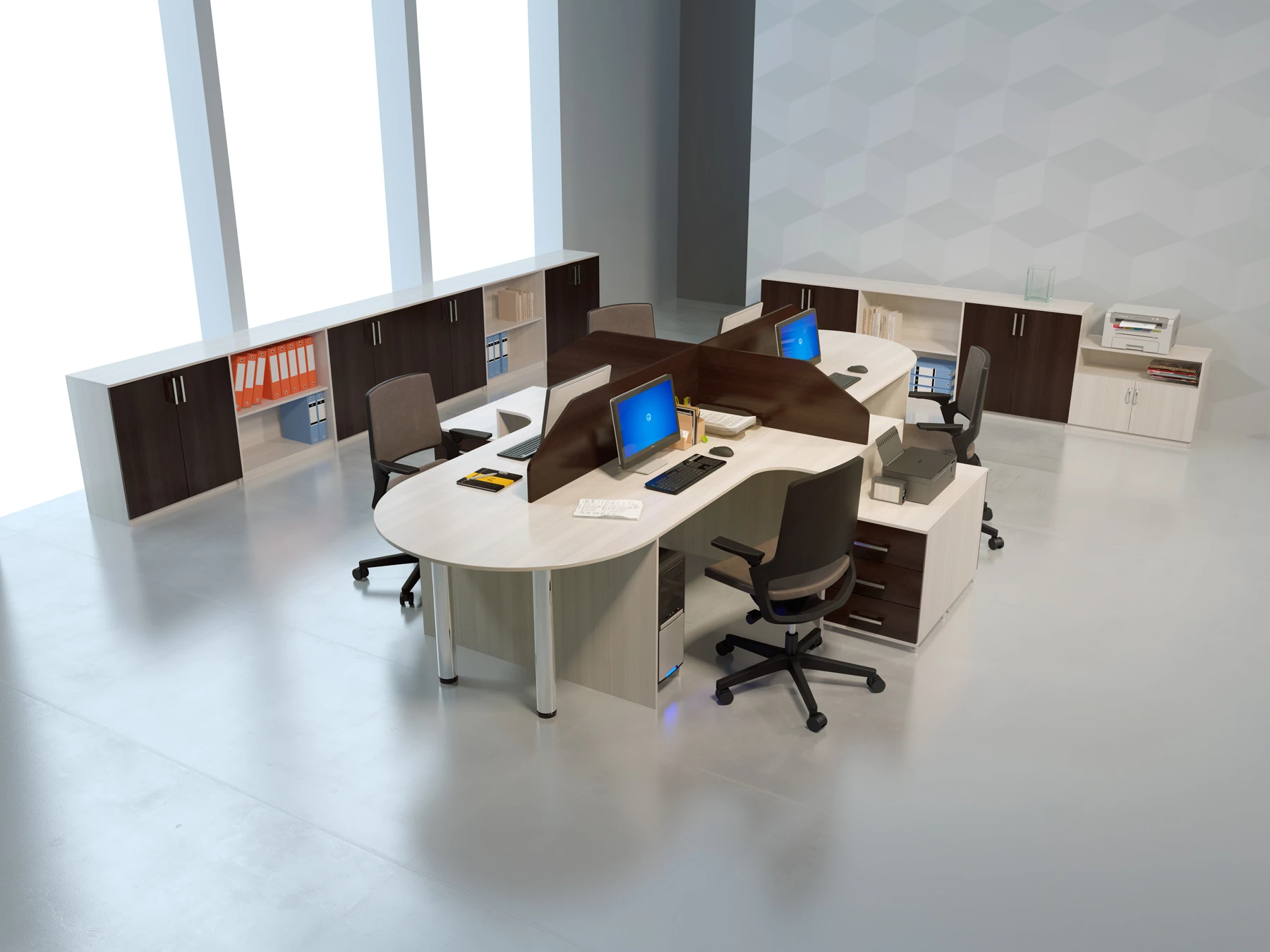 «Матрица» – серия практичной мебели класса «эконом». Она отличается эргономичным дизайном, хорошо подогнанными деталями и аккуратными швами. Эта бюджетная офисная мебель выглядит дорого за счет благородных расцветок: темный мали венге и светлый ясень шимо.